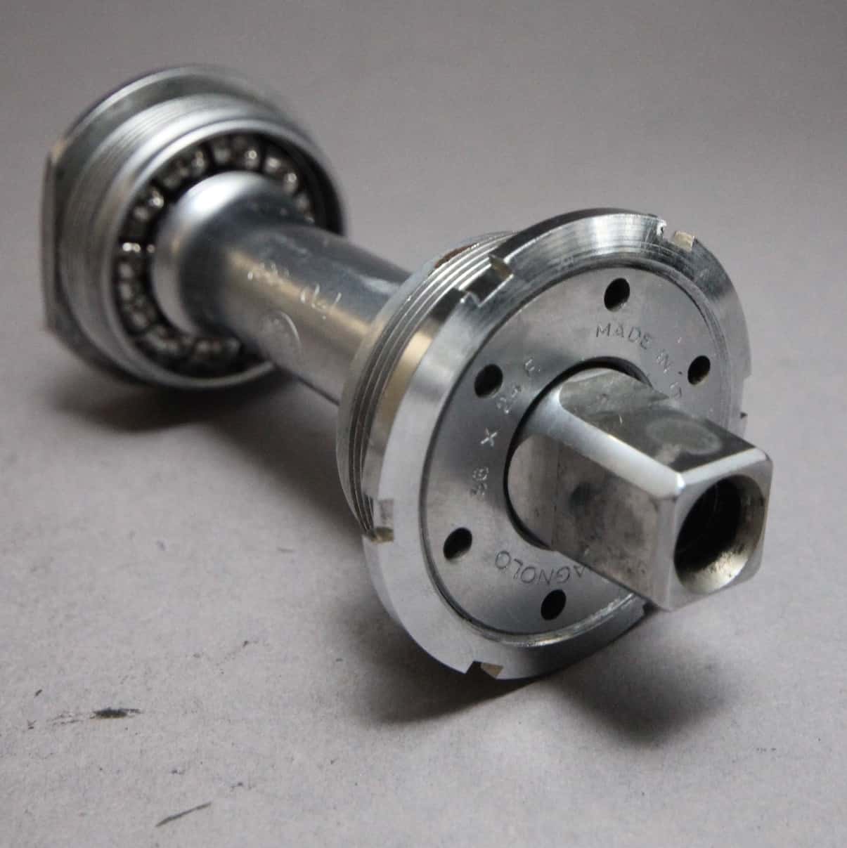 Introduced along side Triomphe in 1984, the Victory group first appeared in Campagnolo catalogs in 1985. The two groups were discontinued in the late 1980’s and replaced with Athena and some new named Campagnolo mid range groups like Mirage and Veloce. Victory was better finished then Triomphe Bracket Spindle. The Victory had a chrome/nickel finish, where the Triomphe spindle was blued. The Victory and Triomphe line also had a triple crank designated LX or “Leasure”.