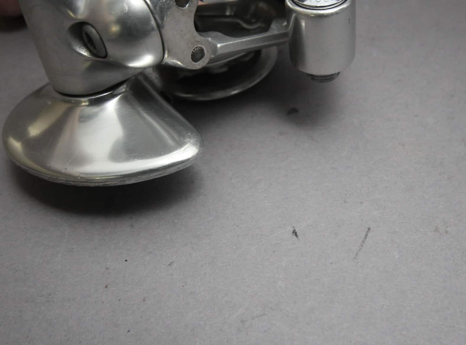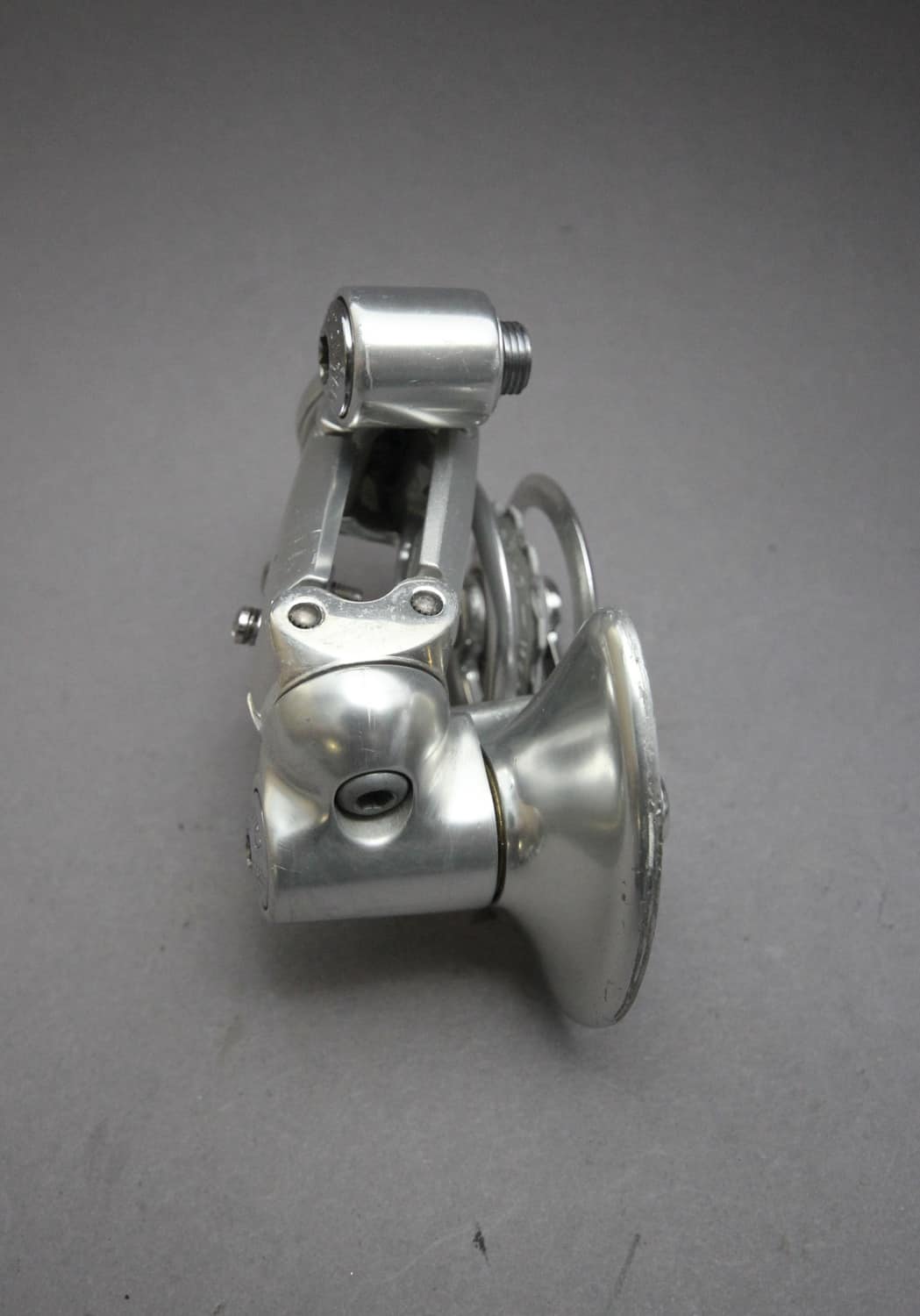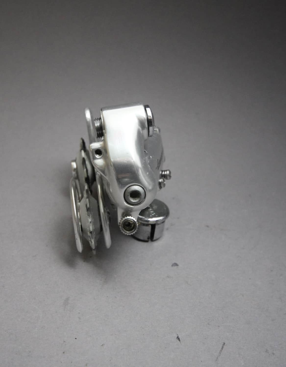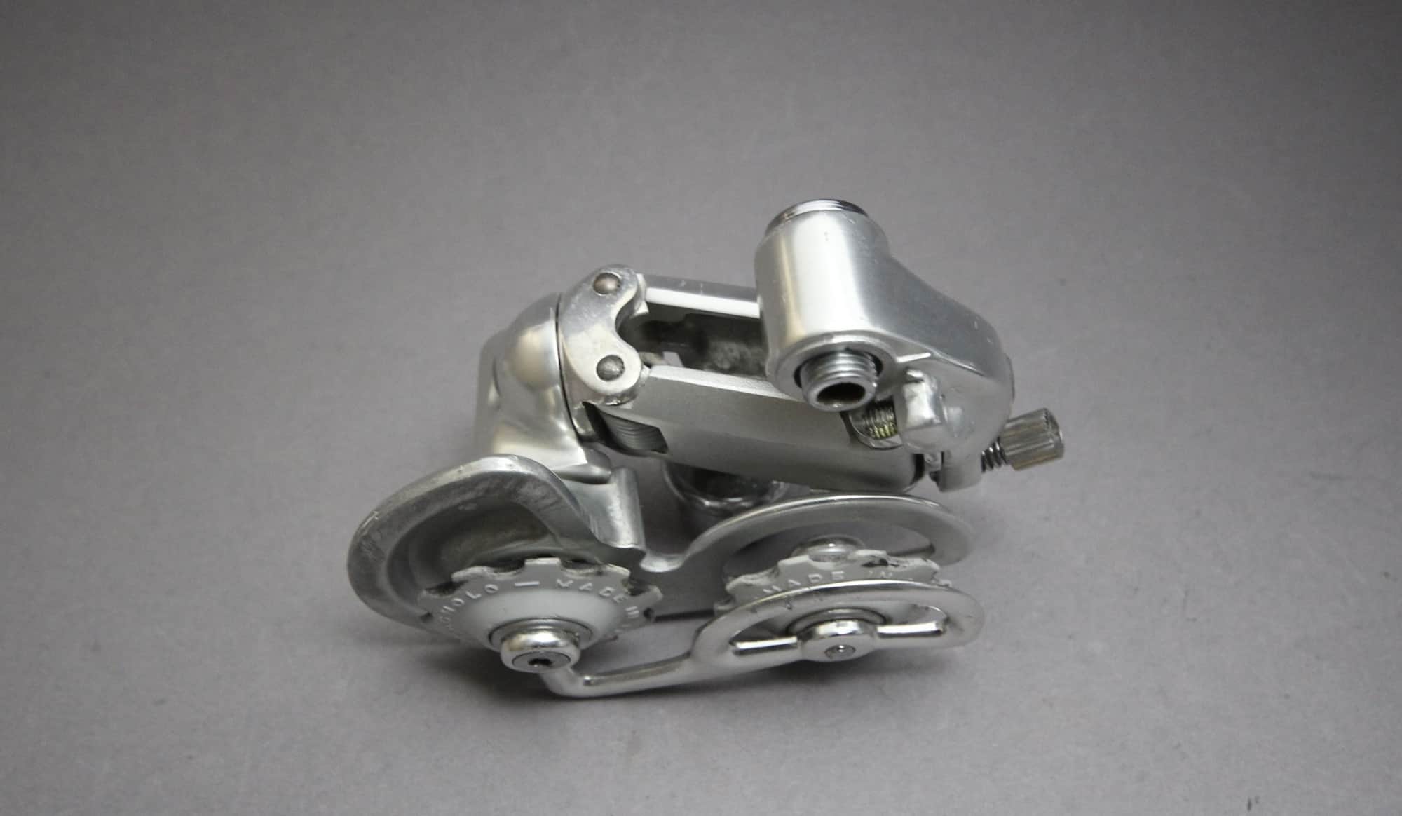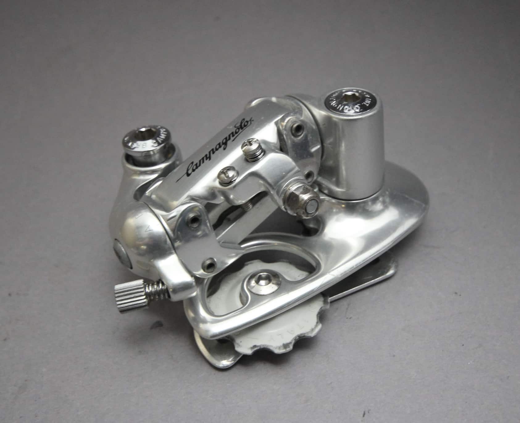 The Campagnolo Chorus rear derailleur was designed with the ‘Dual Mode’ system. The Dual Mode system allowed the derailleurs parallelogram to be rotated in different working positions at 5 degrees and 30 degrees. Max Cog:- A position 27 teeth, B position 32 teeth. The Derailleur worked with Campagnolo Syncro and Syncro II Shifters, which came in 6, 7 and 8s versions.