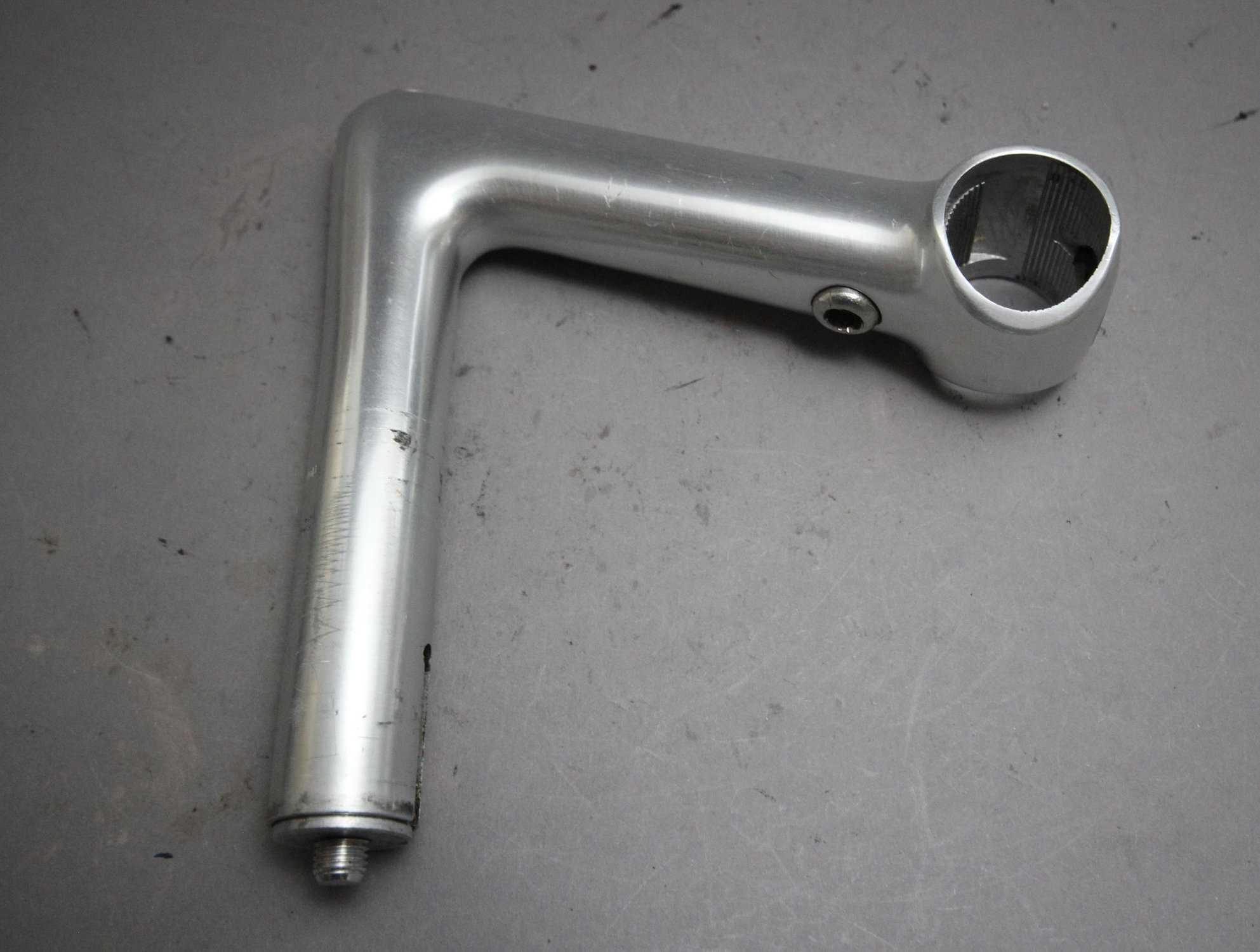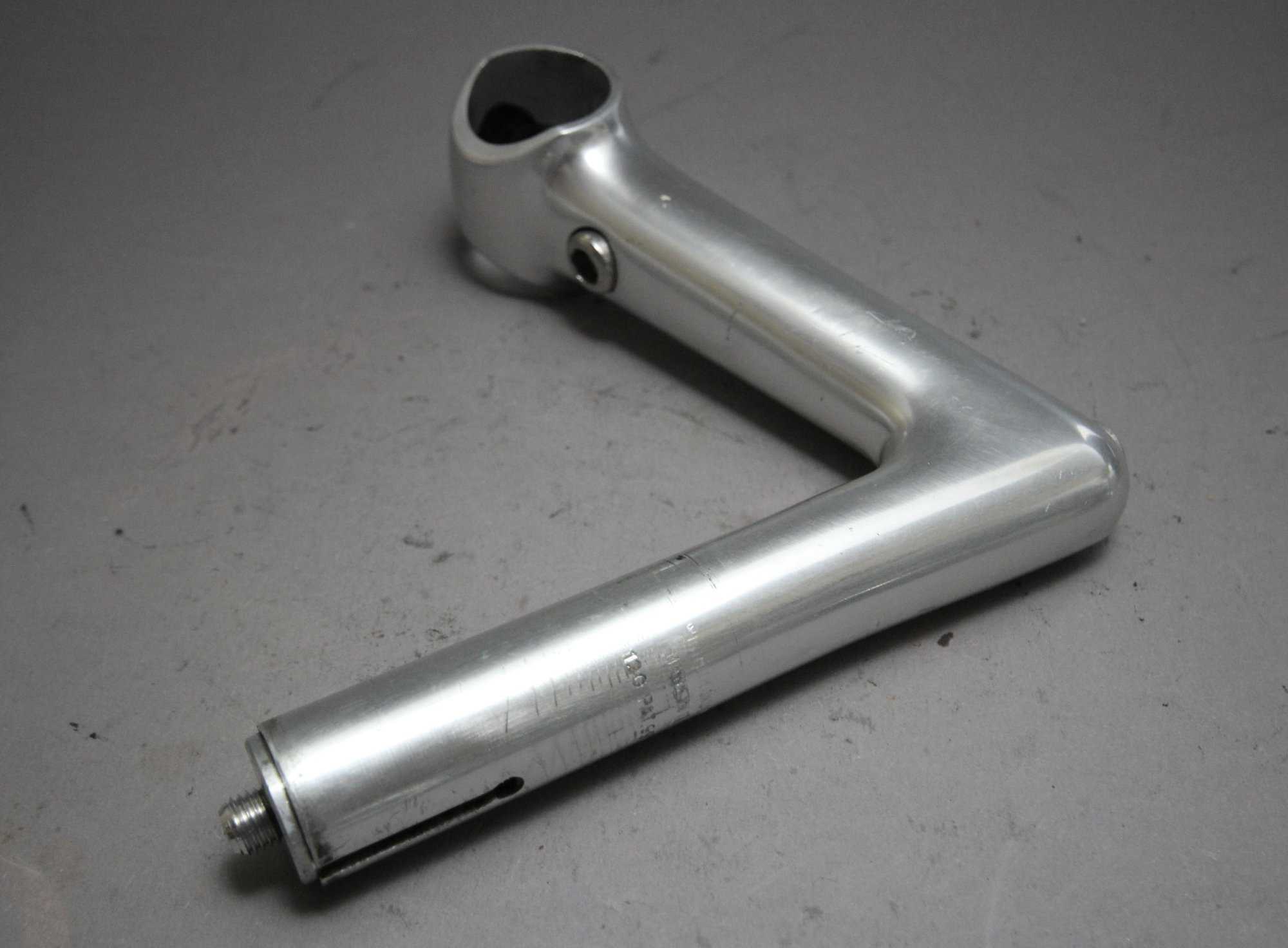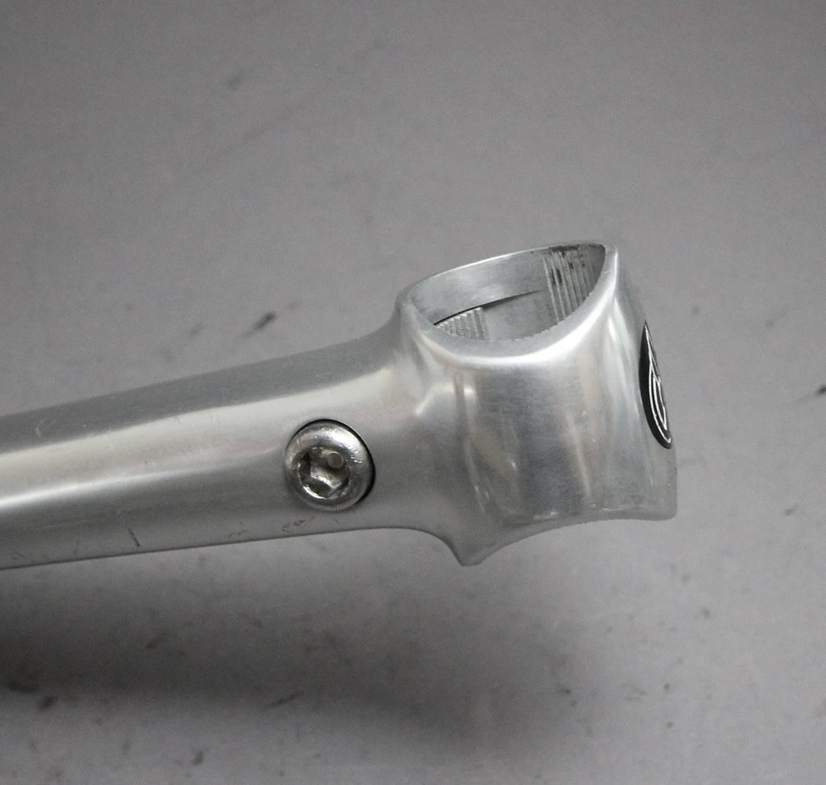 The 1R from Cinelli was introduced in the late 1970’s.  The 1R’s bar clamp design is different from that of the XA and other cinelli stems. Its bolt pushes a plate up against the bar from the back side, securing the bar in place.  The first version has the word ‘Cinelli’ across the front insert instead of the more common and later winged Cinelli ‘C’ emblem.  The top engraving is also the older “Cinelli Milano” than the later more simple typo.