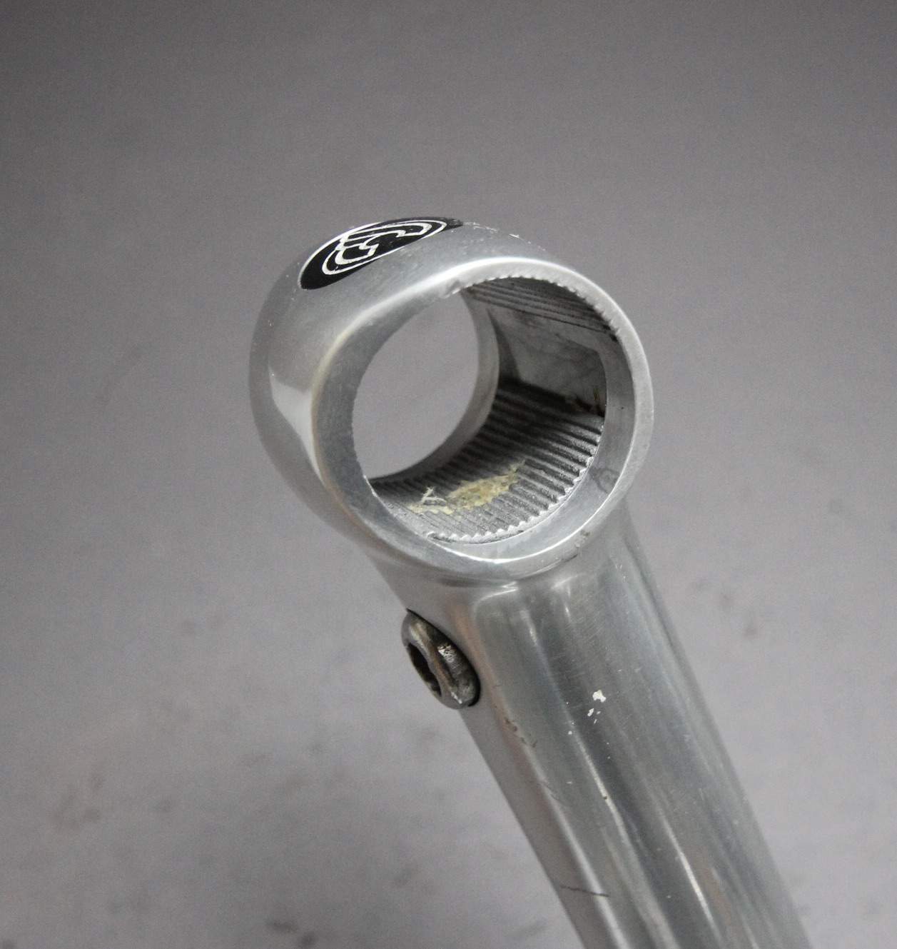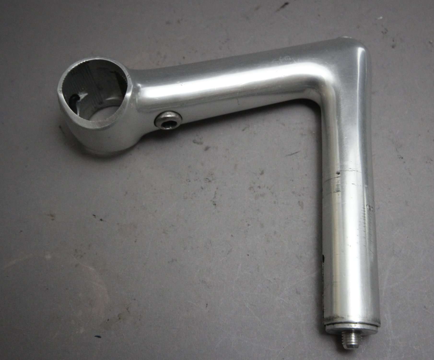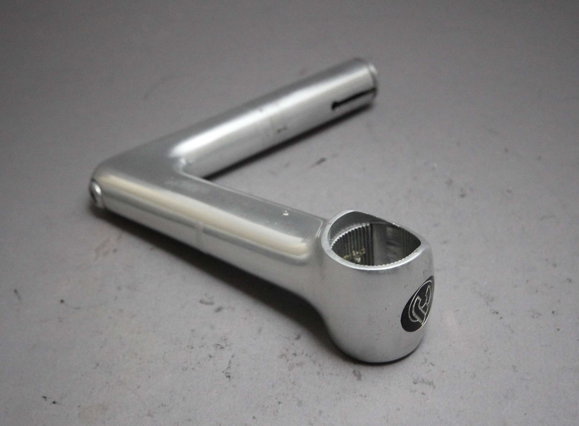The 1R from Cinelli was introduced in the late 1970’s.  The 1R’s bar clamp design is different from that of the XA and other cinelli stems. Its bolt pushes a plate up against the bar from the back side, securing the bar in place.  The first version has the word ‘Cinelli’ across the front insert instead of the more common and later winged Cinelli ‘C’ emblem.  The top engraving is also the older “Cinelli Milano” than the later more simple typo.